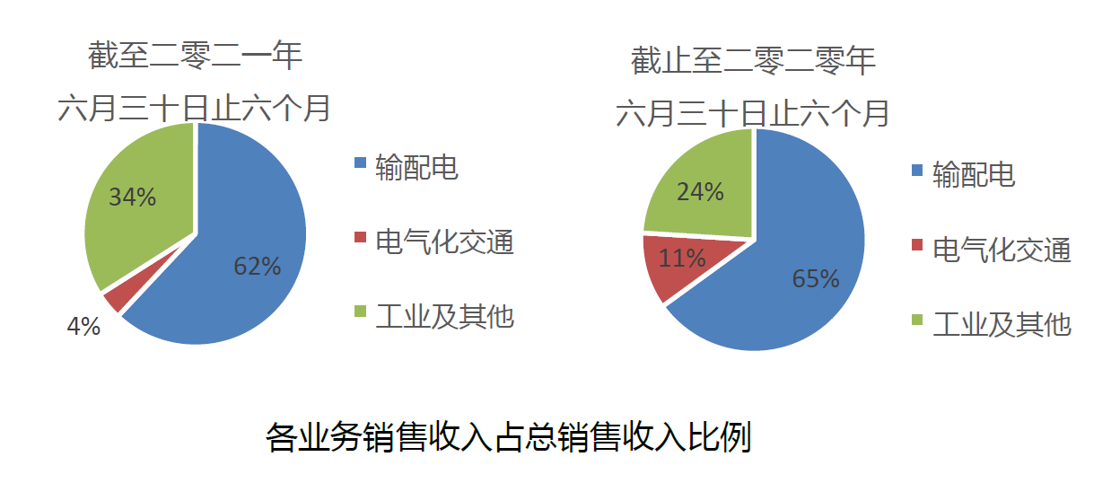 輸配電領域,本集團于回顧期內(nèi)實現(xiàn)銷售收入人民幣3.03億元,占期內(nèi)總銷售收入約62%,毛利率為27.7%。根據(jù)「十四五」規(guī)劃及國家電網(wǎng)公司發(fā)布的「碳達峰、碳中和」行動方案,高壓直流輸電領域投資和建設規(guī)模將保持較高水平,「十四五」期間將建成七個國內(nèi)特高壓直流輸電工程,新增輸送容量5600萬千瓦。2021年上半年,集團主要交付「陜北-武漢」工程、「白鶴灘-江蘇」項目、±800kV復龍換流站項目訂單,及大灣區(qū)南粵直流背靠背工程訂單。