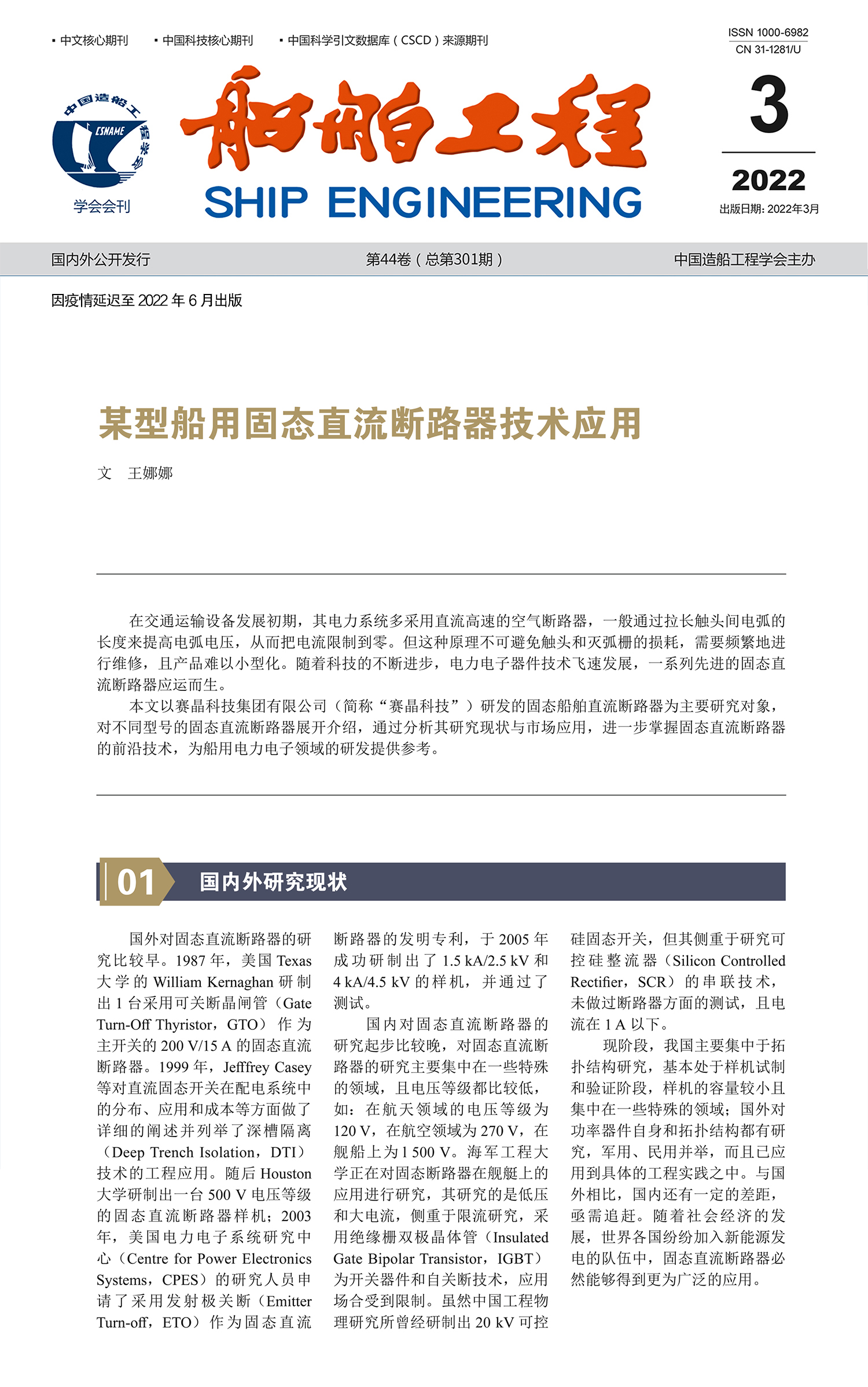 國家核心期刊《船舶工程》刊登專題文章《某型船用固態直流斷路器技術應用》,介紹了國內外船用直流斷路器的工作原理和發展現狀。該文以沙龙365国际网站船用固態直流斷路器為研究對象,闡明了在該領域前沿技術創新和探索中,沙龙365国际网站取得的出色成果;例舉了沙龙365国际网站產品的技術特點和優勢,以及國際市場中取得的實用業績。