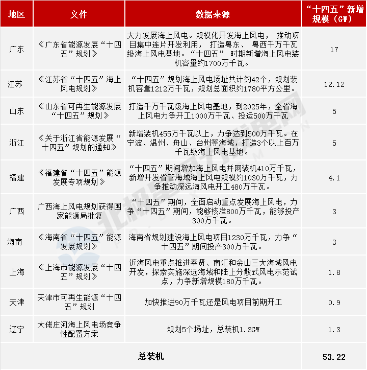 此規劃一出,沿海風電開發迎來了新的市場機遇。據統計,沿海各省規劃的“十四五”海上風電開發目標超過5000萬千瓦,其中廣東、浙江、江蘇、山東省規劃體量較大,分別達到17GW、5GW、12.12GW、8GW。扣除2021年新增裝機的1448萬千瓦,還有超過3500萬千瓦新增空間。