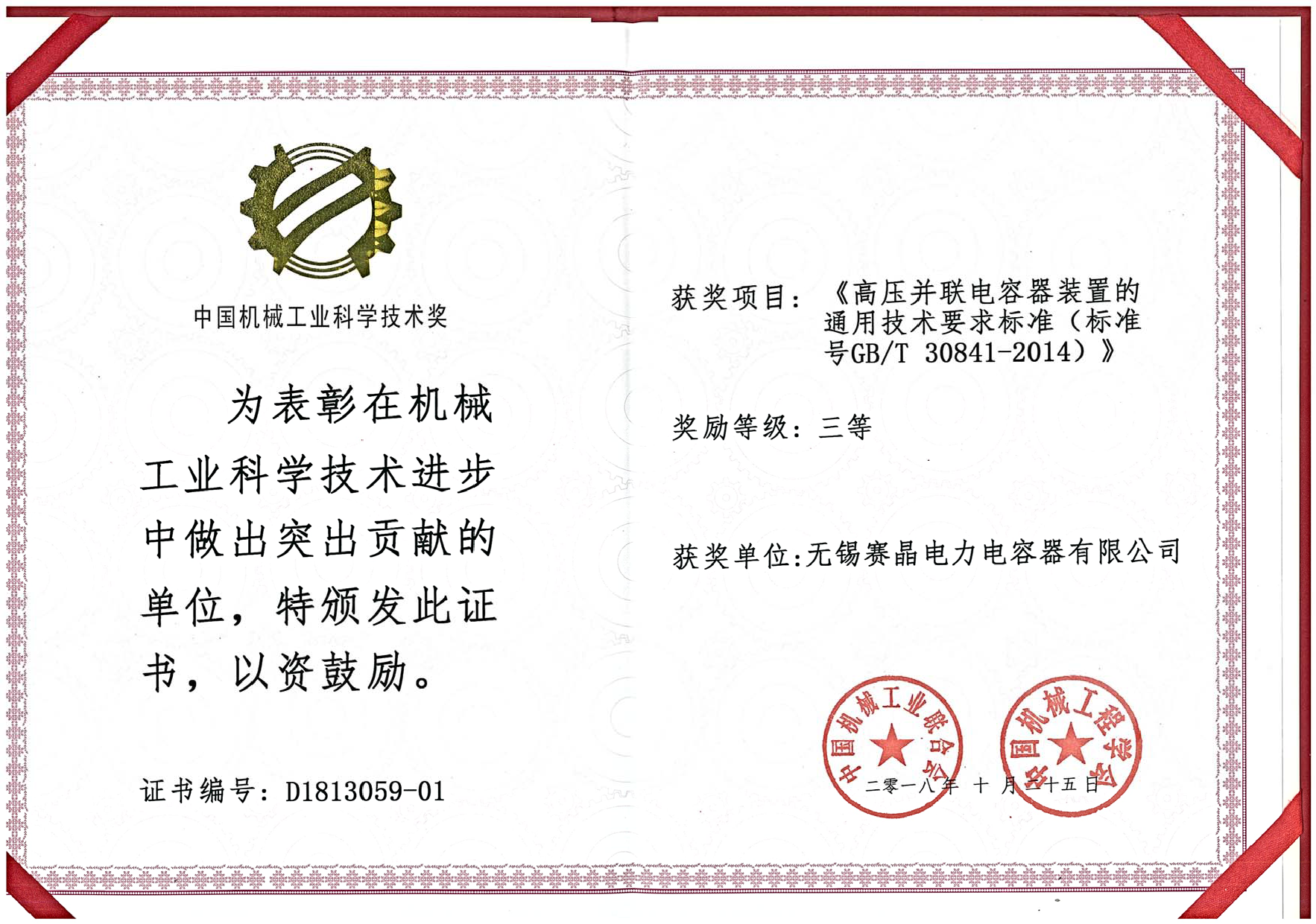 公司目前共申請專利55項,獲授權專利37項,其中5項發明專利,32項實用新型專利。主導完成了《GB/T30841-2014 高壓并聯電容器裝置的通用技術要求》、《GB/T 11024.1-2019 標稱電壓在1000V以上交流電力系統用并聯電容器 第1部分:總則》兩項國家標準的制修訂工作,其中主持制定的標準《GB/T30841-2014 高壓并聯電容器裝置的通用技術要求》榮獲了中國機械工業科學技術獎三等獎、電工標準-正泰創新獎一等獎。2016年獲評國家級高新技術企業并連續保持;2017年獲評蘇南國家自主創新示范區瞪羚企業,獲評惠山區智能制造示范工程-智能車間和無錫市智能車間榮譽稱號;2018年獲評國家級、省級兩化融合管理體系貫標試點;2019年成功申報無錫市企業技術中心。